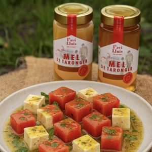La dolçor natural de la síndria i la mel contrasta amb la salinitat del formatge feta i l’aroma fresca de la menta. La vinagreta es fa en un moment: només cal barrejar mel de flors de l’Avi Lluís, suc de llimona, oli d’oliva verge extra i menta picada. És un plat que combina sabor i nutrició, amb ingredients de temporada i un toc únic gràcies a la nostra mel artesana.