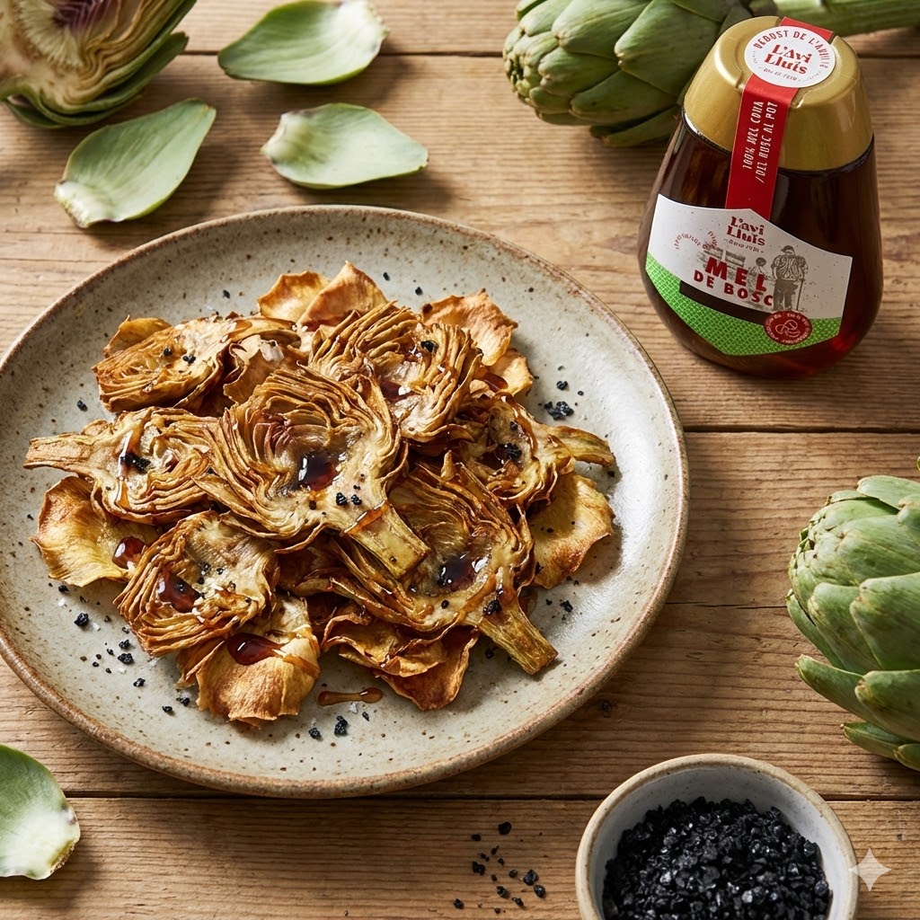 Chips de Alcachofa Crujientes con Miel de Bosque y el toque exótico de la Flor de Sal Negra