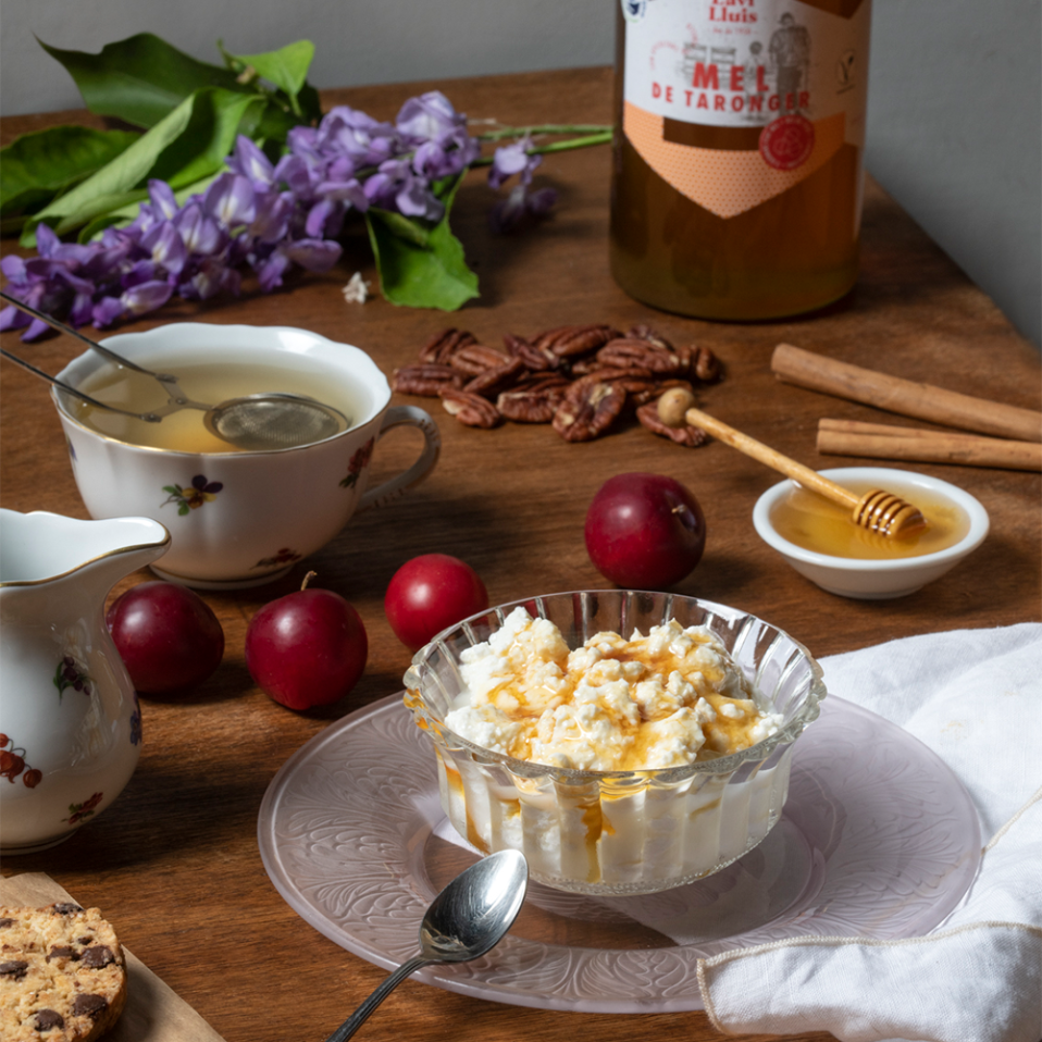 Este queso fresco es rico en proteínas y calcio, mientras que la miel de azahar aporta un toque floral único, propiedades antioxidantes y beneficios para la digestión.